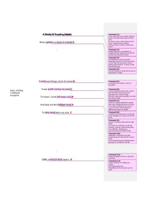 Apr 24, · After analyzing the poem, the title, "A Study of Reading Habits", now seems ironic since it presents itself as a dry, academic study of perfecting reading habits but is actually a humorous poem about a man's dynamic relationship with books. The poem's rhyme scheme is consistent and the same in each stanza (ABC BAC) Feb 01, · Analysis of A Study of Reading Habits by Philip Larkin. A Study Of Reading Habits. By Philip Larkin. When getting my nose in a book. Cured most things short of school, It was worth ruining my eyes. To know I could still keep cool, And deal out the old right hook. To dirty dogs twice my blogger.comted Reading Time: 2 mins A Study Of Reading Habits Analysis. what he is saying is that it is how we use books and literature can be unhealthy and dangerous depending on what we do with them. This is the "study